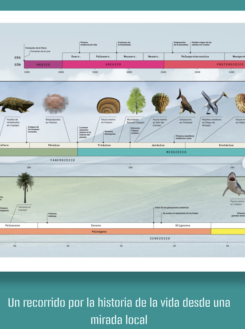 Ese vacío es el que viene a llenar “Hace millones de años en Atacama”, una obra colectiva impulsada por la Corporación para la Investigación y Avance de la Paleontología e Historia Natural de Atacama (CIAHN), que propone algo inédito: reconstruir la prehistoria completa de una región chilena, integrando geología, paleontología y paisaje, desde el Paleozoico (que se remonta a unos 538 años antes del presente) hasta los tiempos recientes.