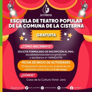 - Consultas en escuelateatrolacisterna@gmail.com y WhatsApp +56 968241792.