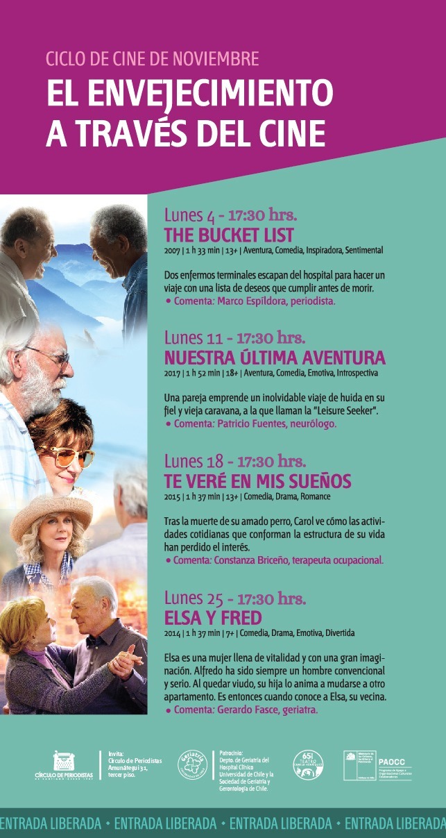 El ciclo comienza el 4 de noviembre con la proyección de Ahora o nunca, dirigida por Rob Reiner. El periodista Marco Espíldora guiará el conversatorio, aportando su visión sobre los temas que la película plantea, especialmente desde el trato a los adultos mayores y los conceptos que manejamos de la vejez.