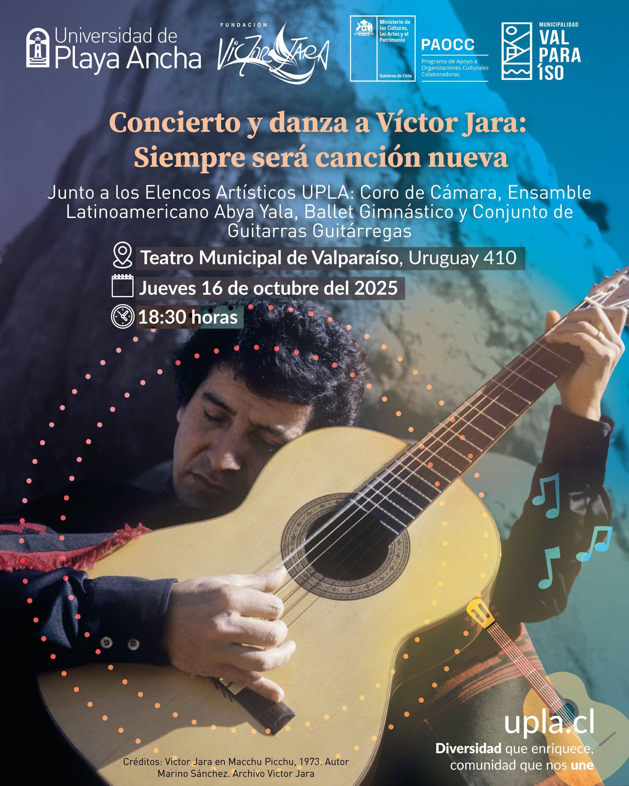 La actividad —gratuita y abierta a toda la comunidad— reunirá a los elencos artísticos de la casa de estudios, en una puesta en escena que combina música, danza y evoca memoria. Sobre el escenario participarán el Coro de Cámara UPLA, el Ensamble Latinoamericano Abya Yala, el Conjunto de Guitarras Guitárregas y el Ballet Gimnástico UPLA, quienes interpretarán parte del repertorio de Víctor Jara en versiones corales, instrumentales y coreográficas.