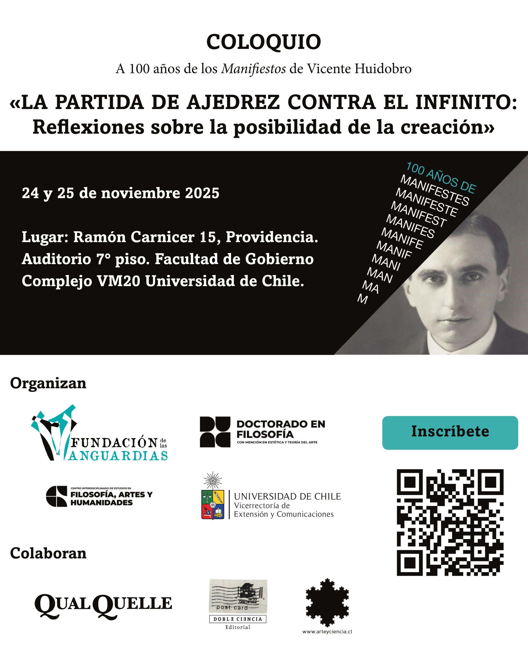 Esta actividad está siendo organizada por nuestra fundación, Fundación de Las Vanguardias, junto al Doctorado en Filosofía mención Estética y Teoría del Arte, el Centro Interdisciplinario de Estudios en Filosofía, Arte y Humanidades (CIEFAH) de la Facultad de Artes y la Vicerrectoría de Extensión y Comunicaciones de la Universidad de Chile. Colaboran: Ediciones Qual Quelle; Doble Ciencia Editorial y www.arteyciencia.cl.