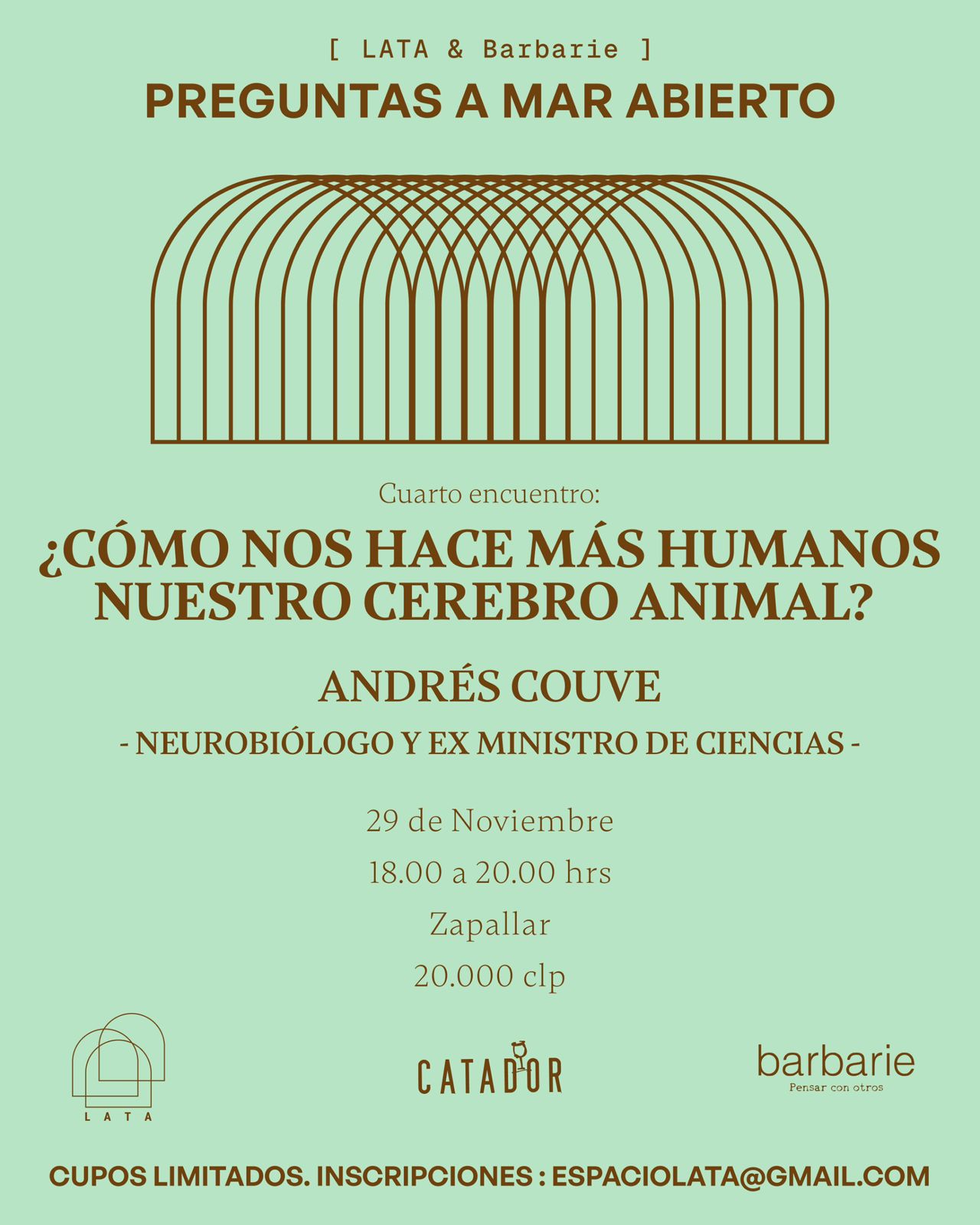 El neurobiólogo Andrés Couve ofrecerá una charla en Zapallar sobre las funciones de nuestro cerebro y sistema nervioso. Como ya viene investigando hace años, el científico mostrará las estructuras neurológicas que comparte el ser humano con el resto de las especies animales para que, reconociendo esta animalidad, sea posible descubrir lo que hace humano al hombre y, desde ahí, diseñar estrategias eficientes para enfrentar los desafíos que plantea la revolución tecnológica y la inteligencia artificial.