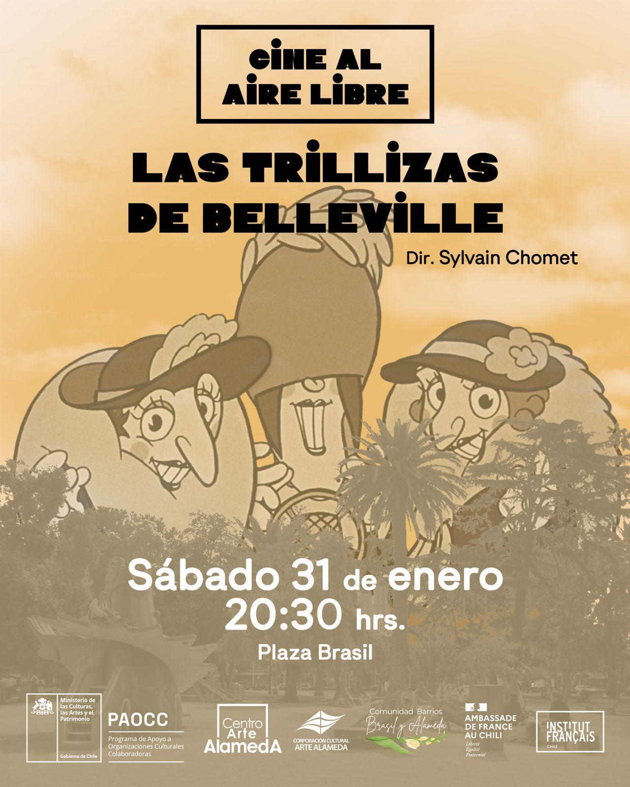 Este sábado 31 de enero a las 20:30 horas se realizará una función de cine al aire libre en Plaza Brasil, en alianza con Centro Arte Alameda: una actividad gratuita y abierta a la comunidad que busca activar el espacio público a través del encuentro y la experiencia colectiva del cine. Se proyectará la película francesa Las trillizas de Belleville (2003), dirigida por Sylvain Chomet, una fantasía de personajes entrañables en la que la abuela Madame Souza viaja a Belleville con su perro Bruno para intentar encontrar a su nieto Champion. La iniciativa cuenta con el financiamiento del Ministerio de las Culturas, las Artes y el Patrimonio a través de su Programa de Apoyo a Organizaciones Culturales Colaboradoras.