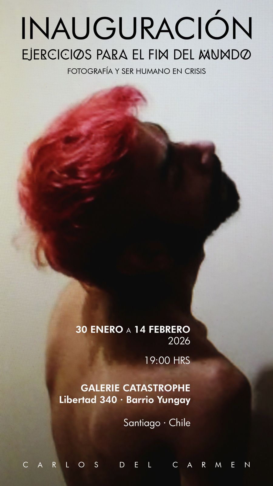 Entre el 30 de enero y el 14 de febrero de 2026, en la Galerie Catastrophe administrada por el dramaturgo italiano Peter Hubert se presenta Ejercicios para el fin del mundo. Fotografía y ser humano en crisis, exposición del artista Carlos del Carmen, que se exhibe por primera vez de manera íntegra. La inauguración se realizo el viernes 30 de enero a las 19:00 horas en Avenida Libertad 340, Barrio Yungay, Santiago. La entrada es liberada.