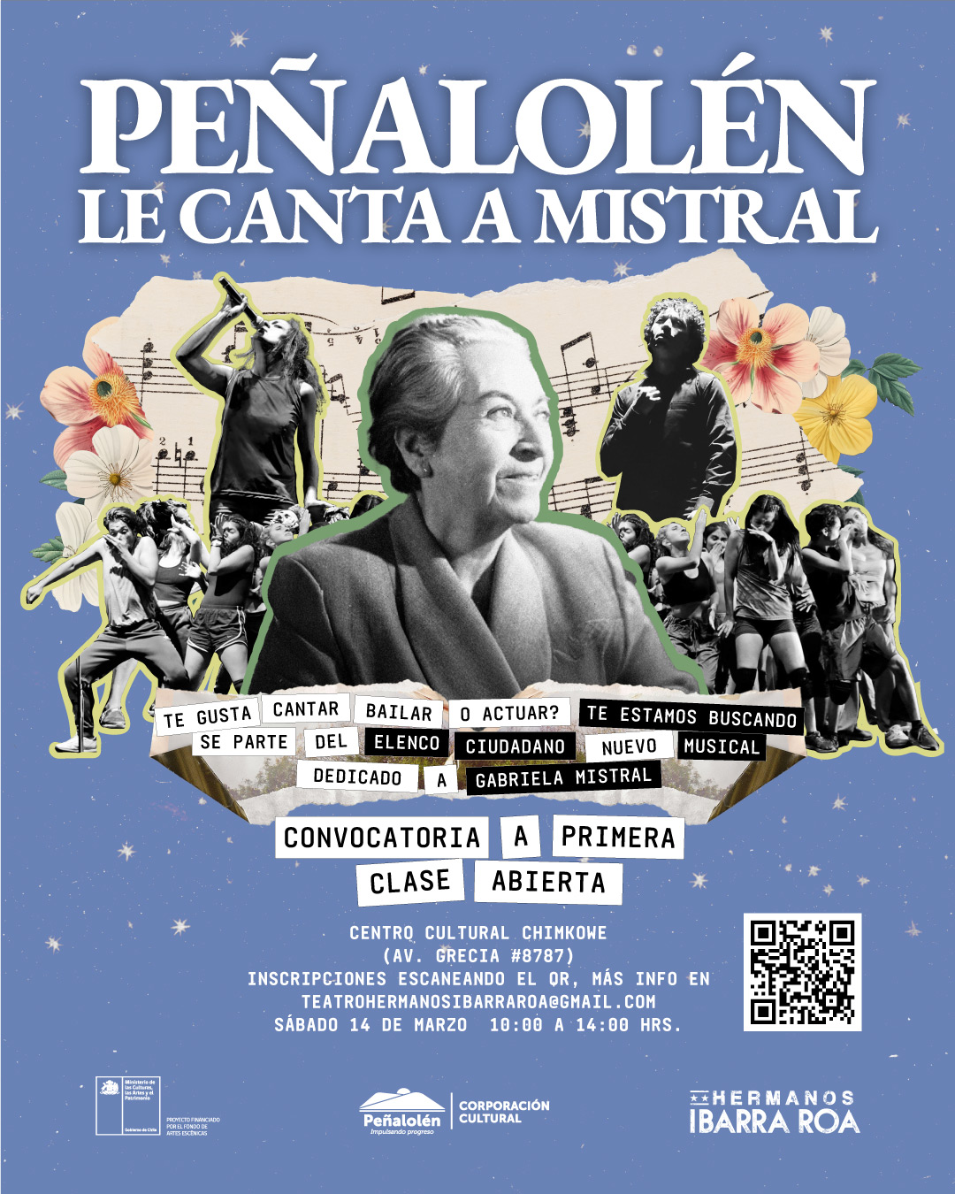 La Compañía Hermanos Ibarra Roa, en conjunto con el Centro Cultural Chimkowe de la Corporación Cultural de Peñalolén, convoca a personas entre 8 y 80 años de edad a participar de su próximo montaje basado en la vida y obra de la Premio Nobel de Literatura Gabriela Mistral.