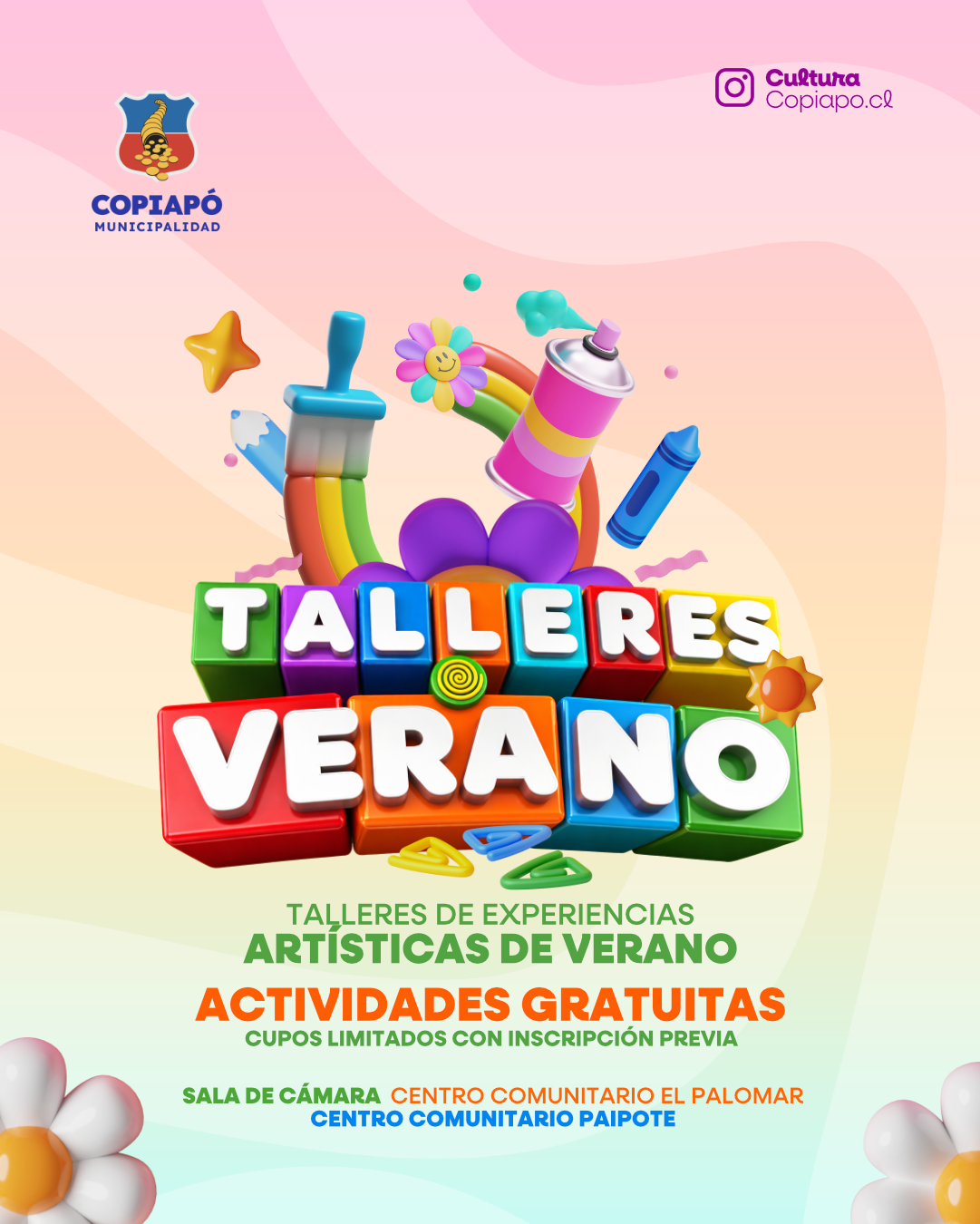 Desde el Departamento de Cultura, Turismo y Patrimonio de la Municipalidad de Copiapó invitan a la comunidad a seguir su cuenta de Instagram @cultura.copiapo.cl, donde se difunden actividades gratuitas y abiertas a la comunidad que se desarrollan durante todo el año en distintos puntos de la ciudad.