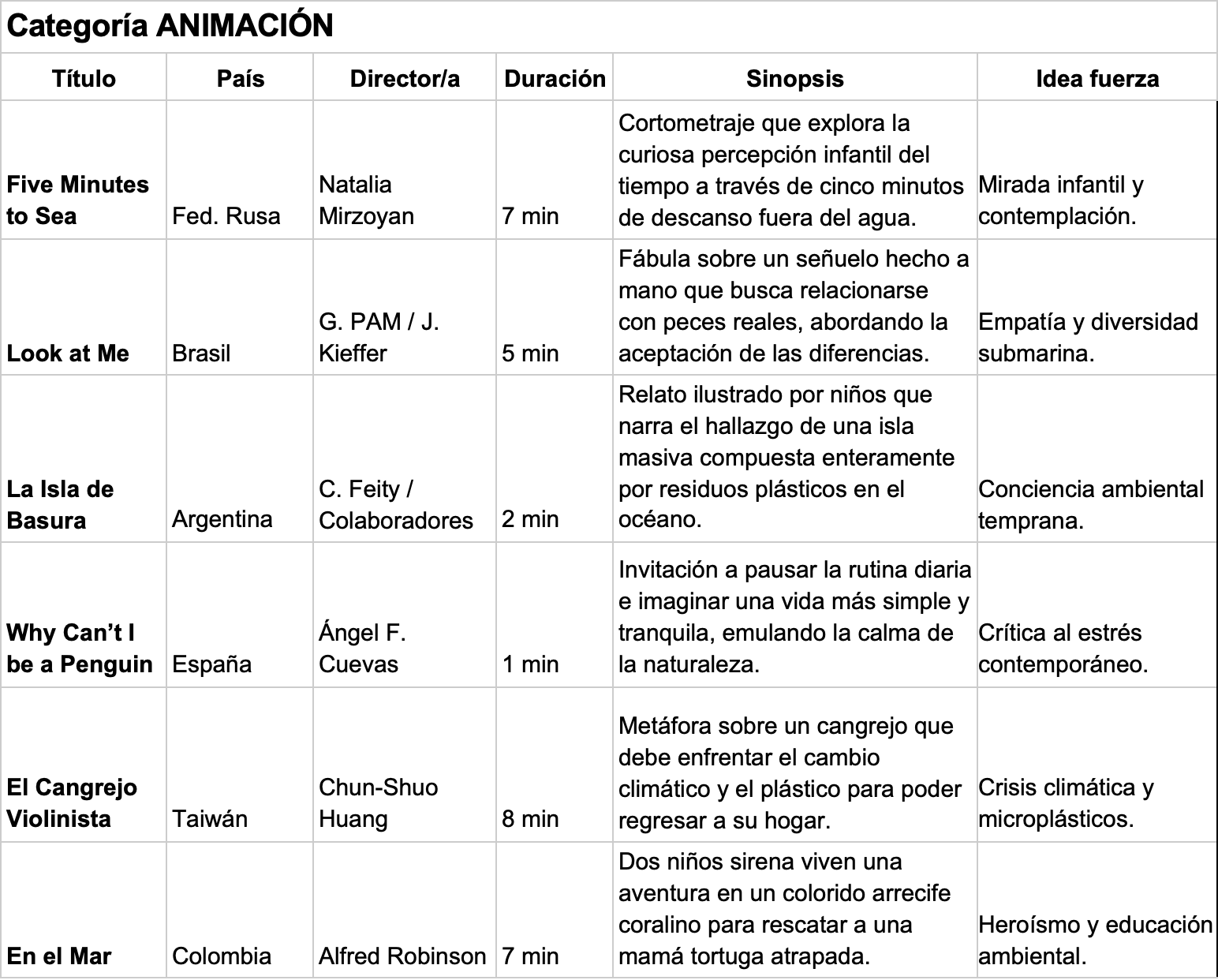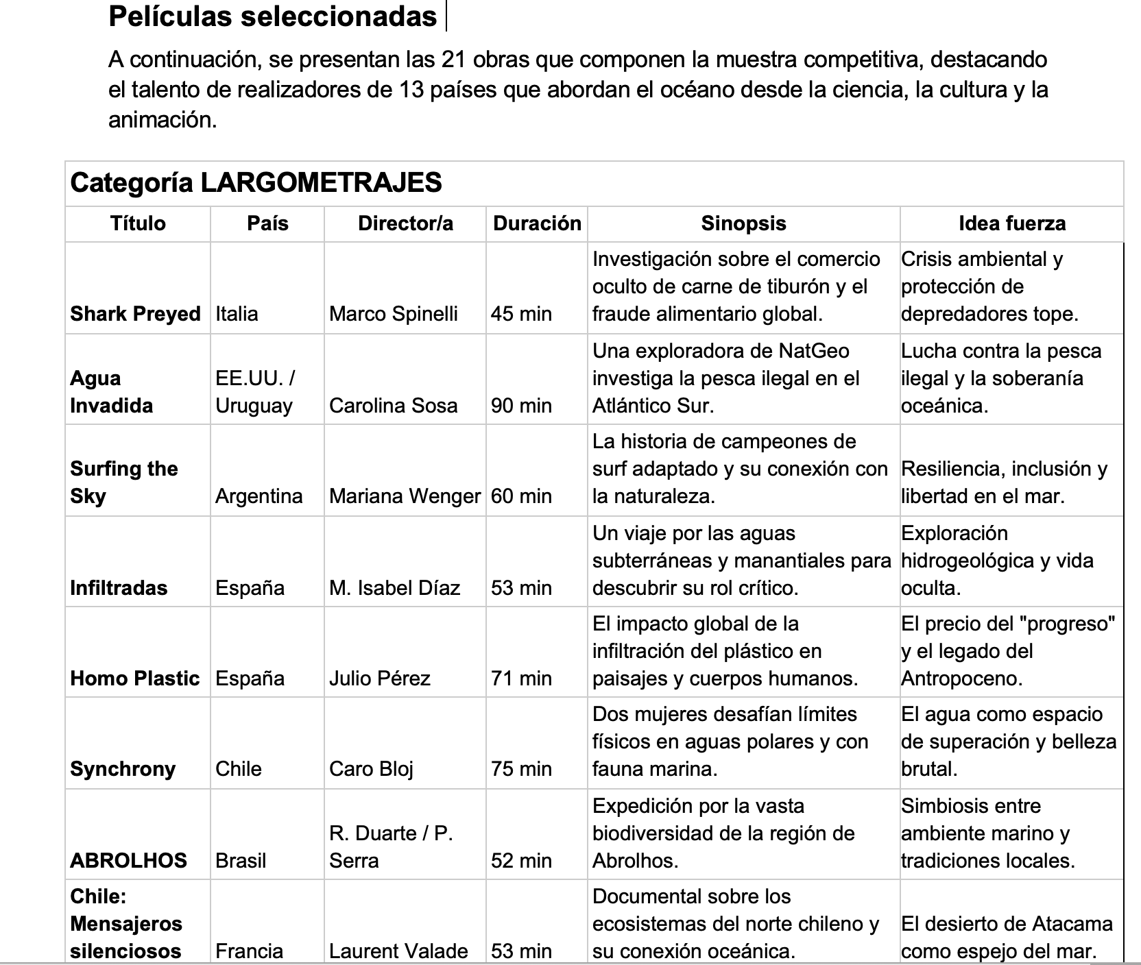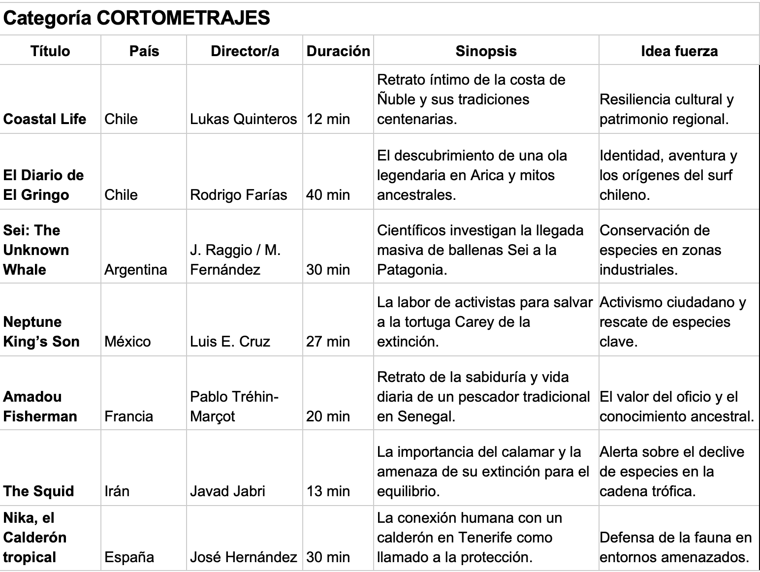 La cartelera de esta cuarta edición destaca por su notable diversidad y alcance global, reuniendo 21 producciones provenientes de 13 países. Organizada en las categorías de Largometraje, Cortometraje y Animación, la programación ha sido cuidadosamente seleccionada para ofrecer una experiencia inmersiva que transita desde la rigurosidad de la investigación científica hasta la sensibilidad del cine de autor. Obras de Chile, Italia, España, Taiwán y Uruguay, entre otros, convergerán en las pantallas penquistas para revelar tanto la belleza oculta como las amenazas urgentes que enfrenta nuestro patrimonio azul.