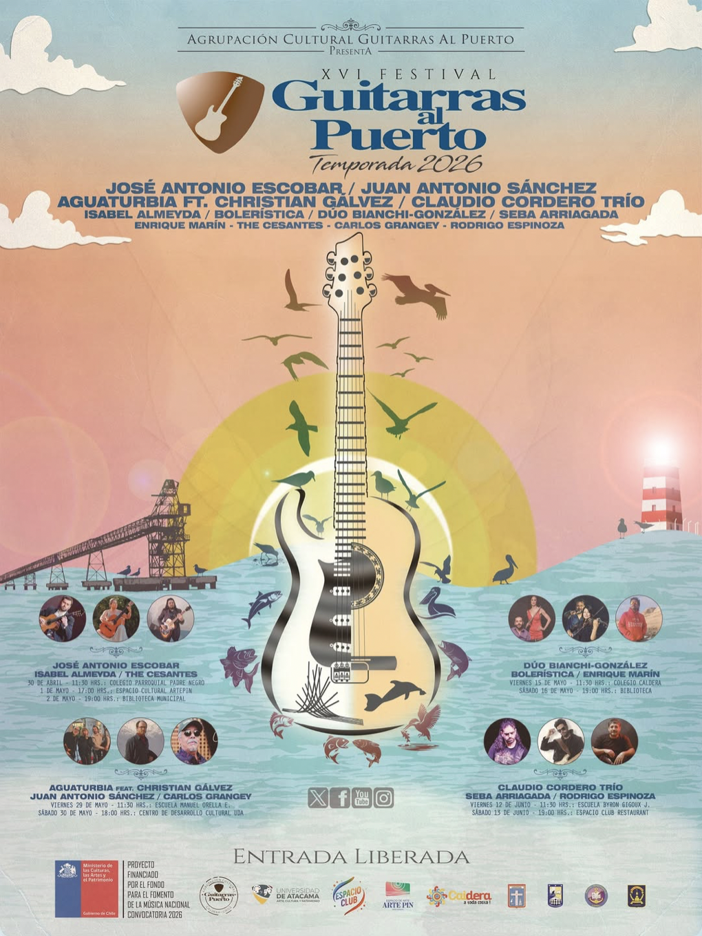 En esta nueva edición, “Guitarras al Puerto” continúa fortaleciendo su identidad como un espacio de encuentro entre distintas generaciones, estilos musicales y territorios, posicionándose como un referente cultural que promueve la música en vivo, la formación artística y el acceso descentralizado a experiencias culturales de alto nivel en la Región de Atacama y donde las guitarras suenan fuerte y dejan eco en Caldera.