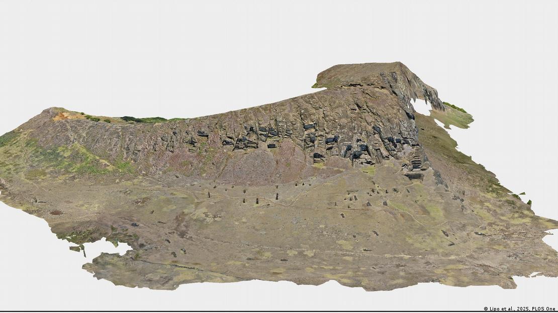 El modelo tridimensional de Rano Raraku, creado con 11.686 imágenes aéreas, reveló la compleja organización espacial de las zonas de producción.Imagen: Lipo et al., 2025, PLOS One