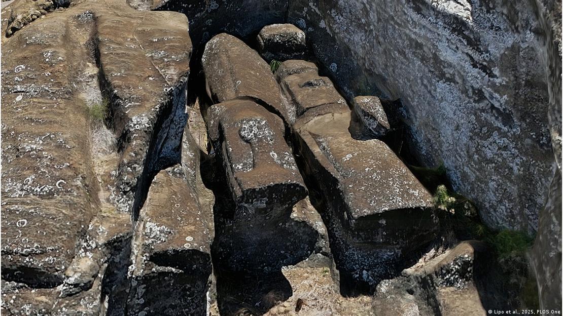 Moáis inacabados adheridos al lecho rocoso revelan en el modelo 3D cómo los talladores trabajaban desde ambos lados hasta separarlos.Imagen: Lipo et al., 2025, PLOS One