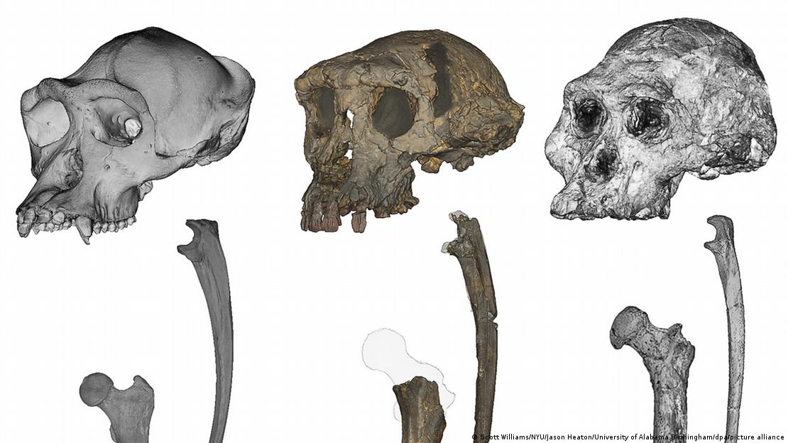 Huesos comparados con el chimpancé (izq.), el S. tsadensis y el Australopithecus (der.)Imagen: Scott Williams/NYU/Jason Heaton/University of Alabama Birmingham/dpa/picture alliance