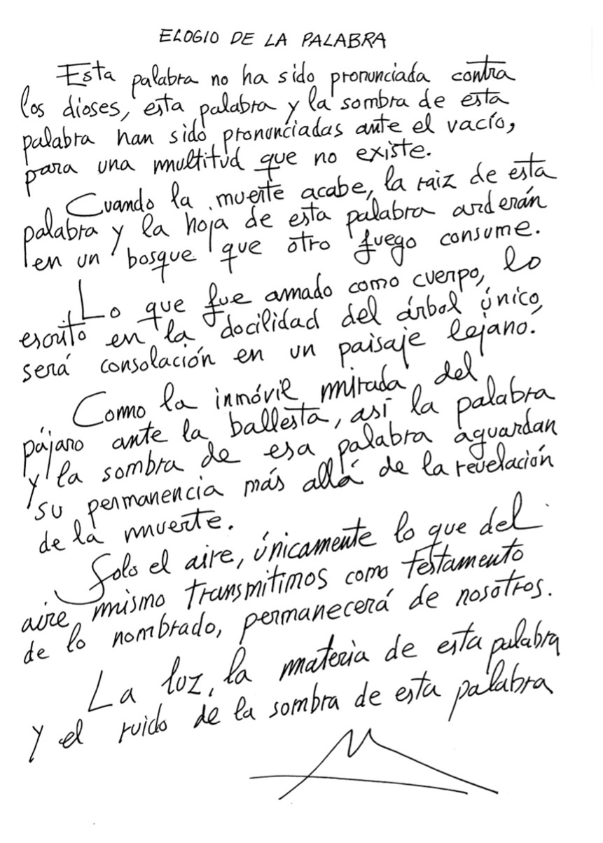 Me persigue un oficio solitario, vigilar toda la noche una gacela, hablar sin seducir, no poseerla y verla irse oscura al diccionario. En esta voluntad cifra el deseo su dulce llama de inocencia donde arde oculta la paciencia del esforzado hijo de Teseo. Al alba quedarán algunos versos de dudoso gusto y sin belleza para el lírico ángel de los muertos. Todo lo demás será olvidado, el ayer y la mística pereza de empezar otra vez en lo acabado. (La poesía ha caído en desgracia, 2014)