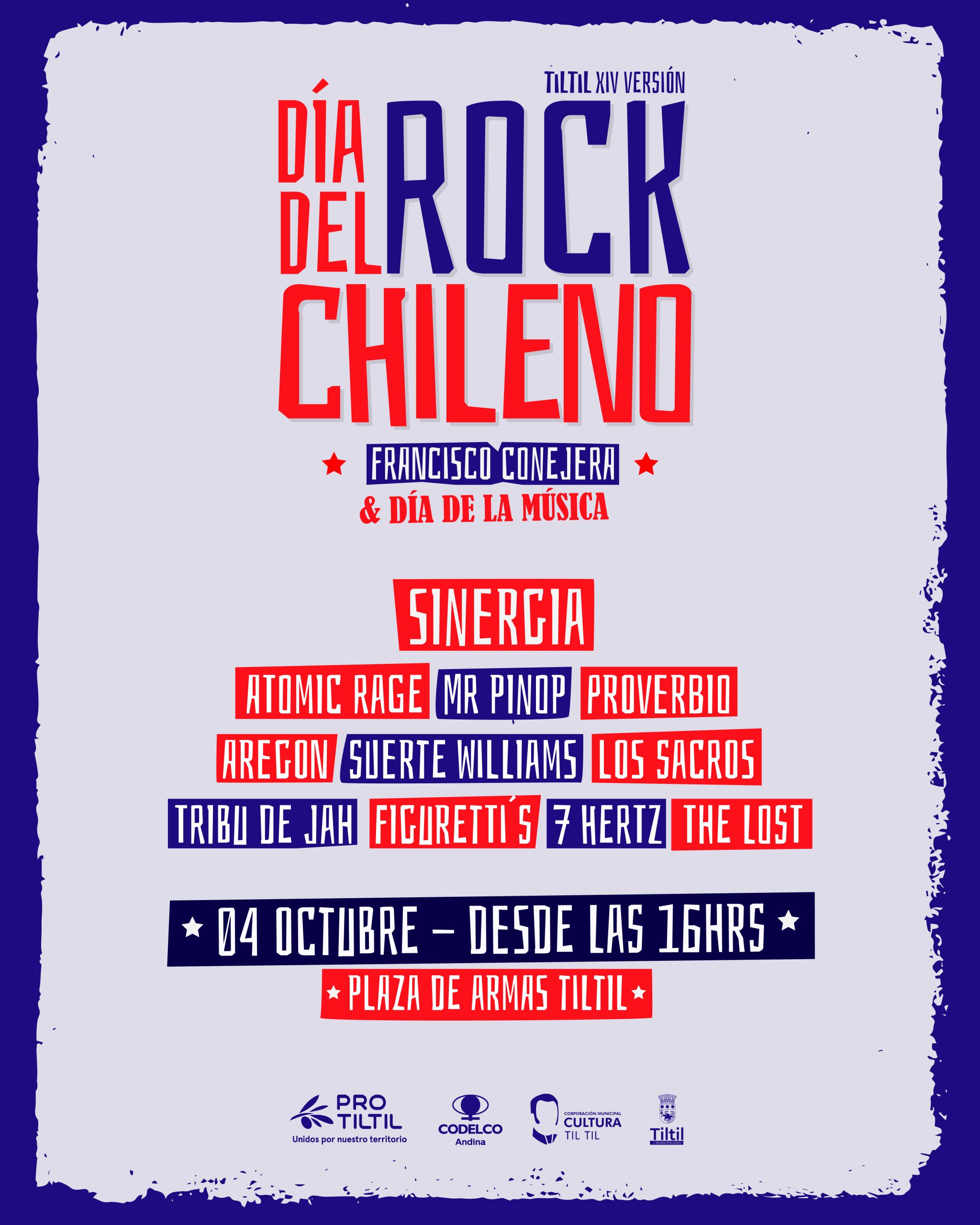 - Para esta XIV versión, la jornada contará con un potente cartel que reúne talento local y proyección musical con Atomic Rage, Proberbio, Mr Pinop, Tribu de Jah, Figuretti’s, Áregon, Suerte Williams y Los Sacros, junto a las bandas formativas del Centro Cultural Tiltil “7 Hertz” y del Centro Cultural Raíces Propias “The Lost”.