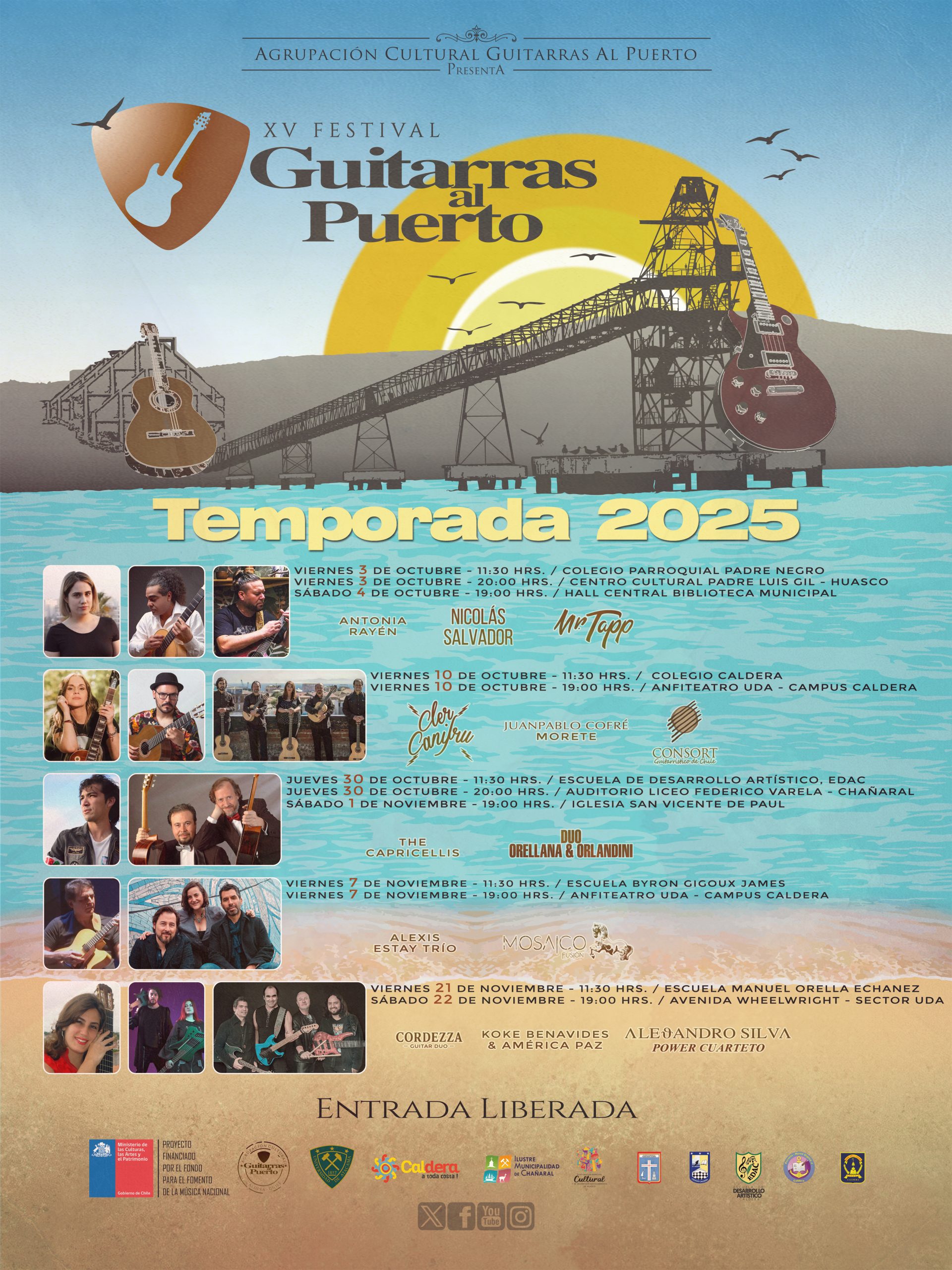 - Habrá interesante y variada gama de estilos y exponentes en la guitarra, donde no faltarán las propuestas para guitarra eléctrica y acústica, ni tampoco los talentos locales y mujeres en el instrumento. Durante esta temporada 2025, sumadas a Caldera, se visitarán las comunas costeras de Huasco y Chañaral.