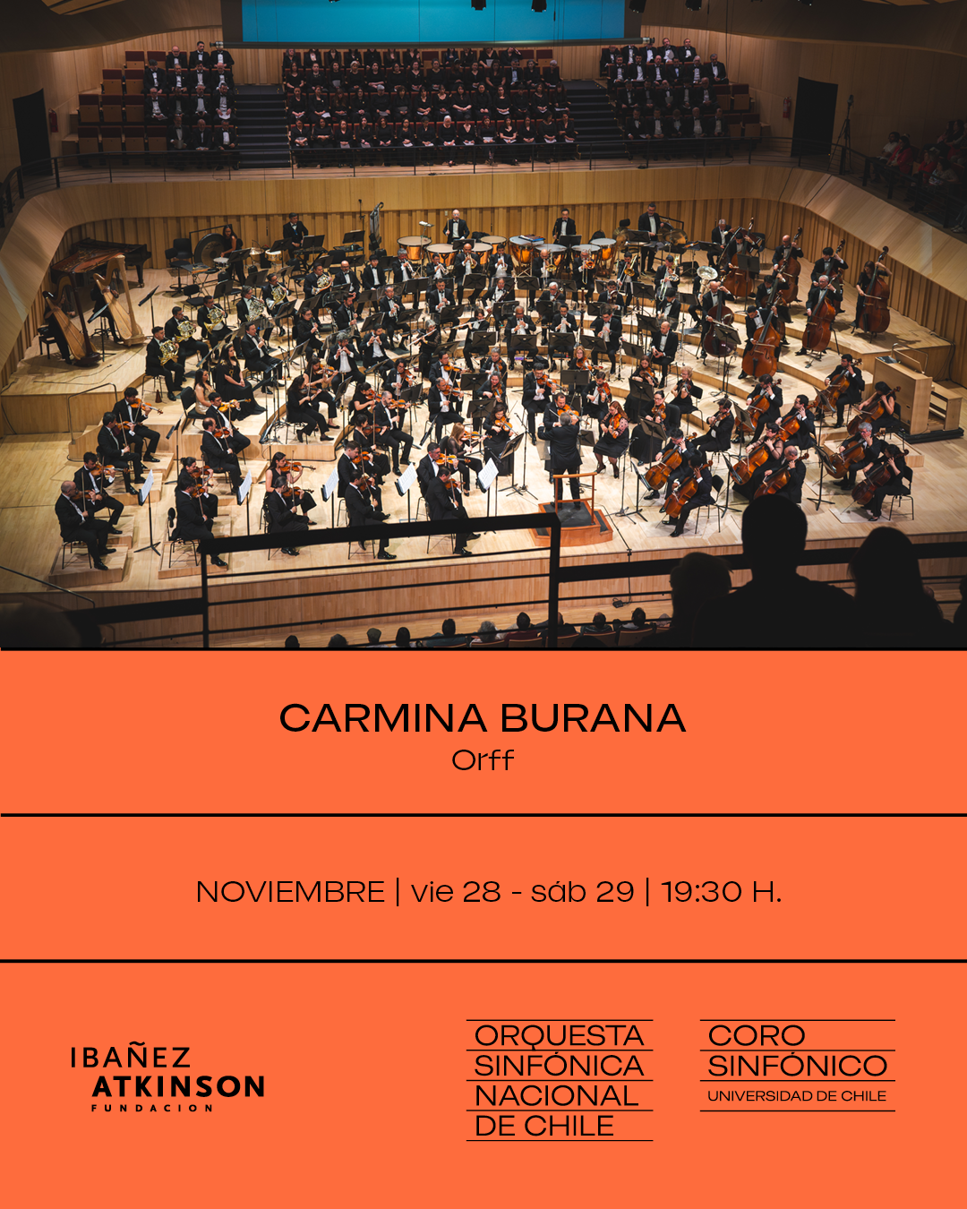 Este sábado, a las 19:30 horas, sonará en la Gran Sala Sinfónica Nacional la cantata Carmina Burana de Carl Orff, interpretada por la Orquesta Sinfónica Nacional de Chile, bajo la batuta del maestro Carlos Vieu, y el Coro Sinfónico Universidad de Chile que dirige Juan Pablo Villarroel.