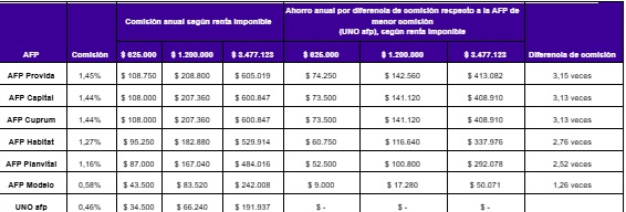Infórmate sobre la rentabilidad de tu Fondo de Pensiones, las comisiones y la calidad de servicio de las AFP en el sitio web de la Superintendencia de Pensiones www.spensiones.cl. AHORRO EN COMISIÓN: $413.000 es el ahorro máximo anual en sueldo bruto con comisión de afiliado de Cuenta de Ahorro Obligatorio en UNO afp (0,46%), calculado a renta tope y UF vigente al 01/11/2025, frente a: Provida 1,45%, Capital 1,44%, Cuprum 1,44%, Habitat 1,27%, Planvital 1,16% y Modelo 0,58%. RENTABILIDAD: La rentabilidad es variable, por lo que nada garantiza que las rentabilidades pasadas se repitan en el futuro. UNO afp es 1° en el promedio anual de la rentabilidad real en los últimos 36 meses (dic. 2022 a nov. 2025) en Fondo A (8,87%), 3° en Fondo B (7,84%), 3° en Fondo C (5,78%), 1° en Fondo D (3,59%) y 4° en Fondo E (2,55%). Fuente: Informe Inversiones y rentabilidad de los Fondos de Pensiones, noviembre 2025, Superintendencia de Pensiones.