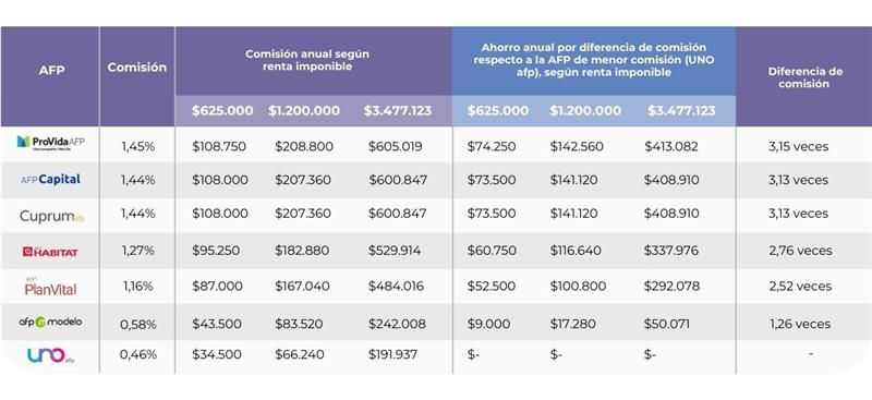 Infórmate sobre la rentabilidad de tu Fondo de Pensiones, las comisiones y la calidad de servicio de las AFP en el sitio web de la Superintendencia de Pensiones www.spensiones.cl. AHORRO EN COMISIÓN: $413.000 es el ahorro máximo anual en sueldo bruto con comisión de afiliado de Cuenta de Ahorro Obligatorio en UNO afp (0,46%), calculado a renta tope y UF vigente al 01/11/2025, frente a: Provida 1,45%, Capital 1,44%, Cuprum 1,44%, Habitat 1,27%, Planvital 1,16% y Modelo 0,58%. RENTABILIDAD: La rentabilidad es variable, por lo que nada garantiza que las rentabilidades pasadas se repitan en el futuro. UNO afp es 1° en el promedio anual de la rentabilidad real en los últimos 36 meses (dic. 2022 a nov. 2025) en Fondo A (8,87%), 3° en Fondo B (7,84%), 3° en Fondo C (5,78%), 1° en Fondo D (3,59%) y 4° en Fondo E (2,55%). Fuente: Informe Inversiones y rentabilidad de los Fondos de Pensiones, noviembre 2025, Superintendencia de Pensiones.