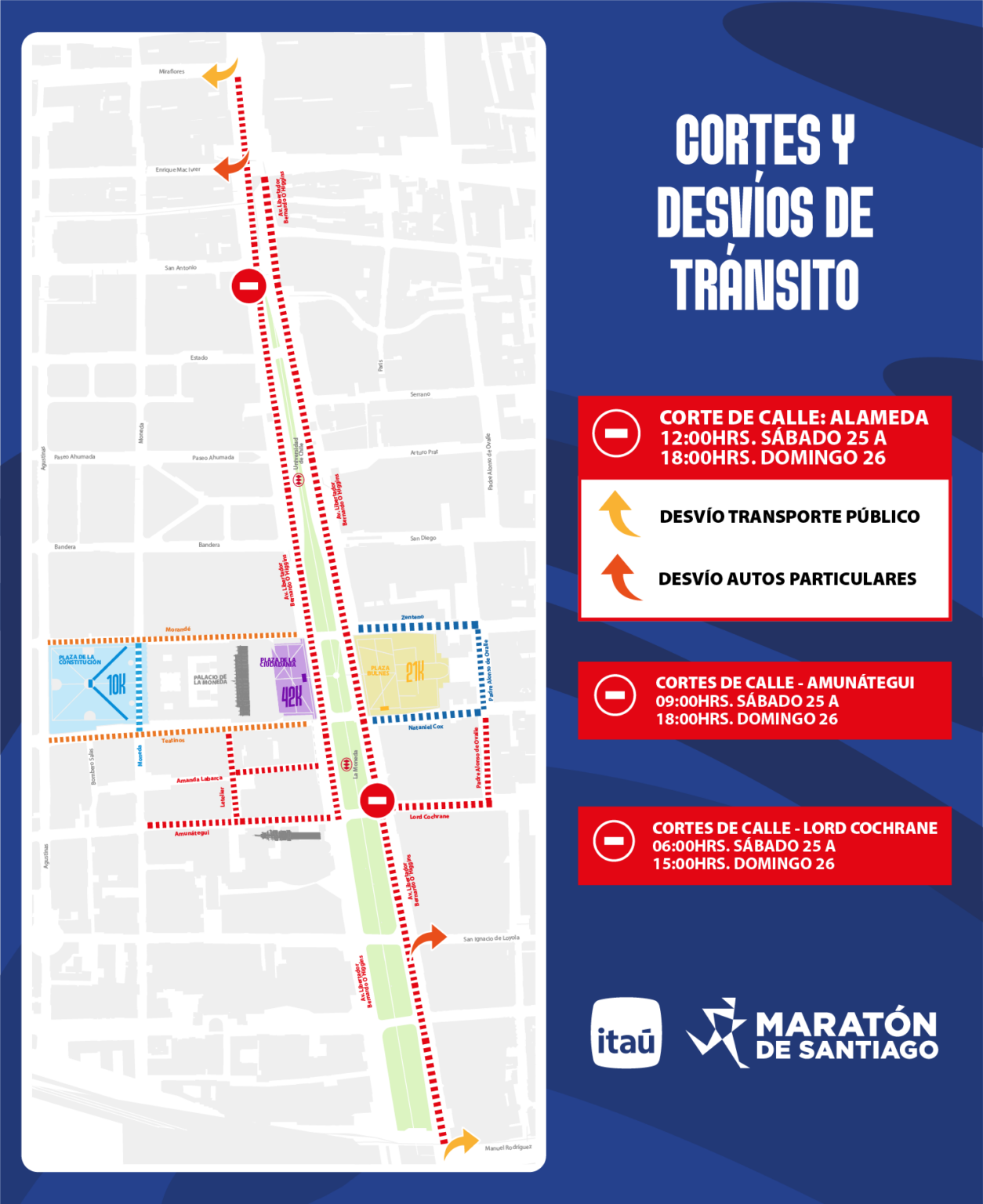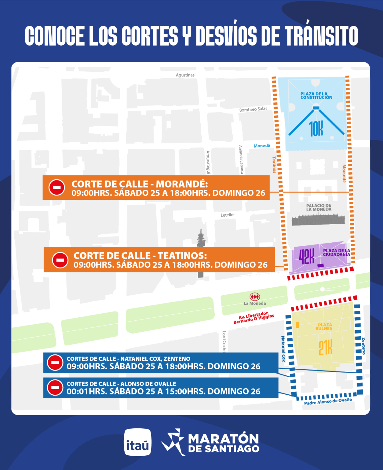 El primer cambio llega antes de la carrera. Desde las 09:00 horas del sábado 25 de abril se suspende el tránsito en los ejes Teatinos–Nataniel Cox y Morandé–Zenteno, entre Agustinas y Padre Alonso de Ovalle, por el montaje de estructuras en el barrio cívico. Esa restricción se mantiene hasta las 18:00 horas del domingo.