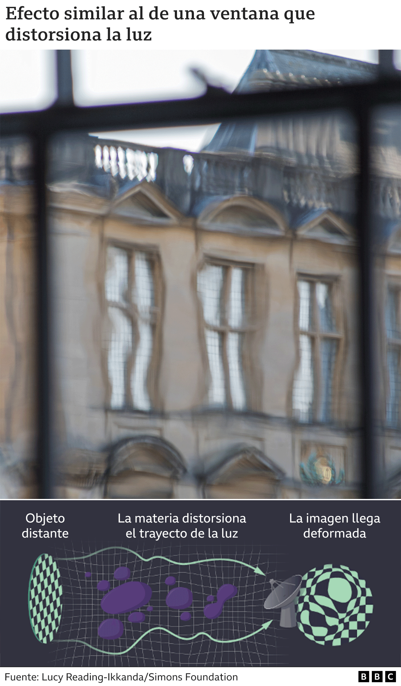 Este fenómeno se le conoce como “lentes gravitacionales” y puede compararse con la forma en que la luz se curva al pasar por las protuberancias de una ventana de cristal.