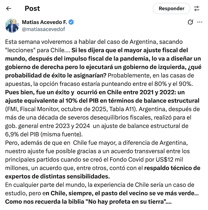 – Nadie es profeta en su tierra. El posteo es del ex-Dipres de Piñera II Matías Acevedo (@matiasacevedof) y habla por sí solo: Milei no hizo el mayor ajuste fiscal de la historia. No, ese lo hizo Chile y sin cepo. Pasen y lean.