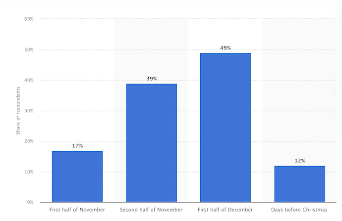 A la hora de comprar regalos de Navidad, parece que somos más organizados que para otras cosas. Una encuesta de Statista revela que cerca de la mitad de los chilenos hace las compras navideñas en la primera mitad de diciembre. Planificados, ordenados y con la lista hecha. Solo un 12% admite dejar todo para el final.