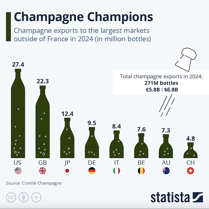 El espumante es uno de los productos más emblemáticos de Francia. Estados Unidos y el Reino Unido son particularmente aficionados a este espumante exclusivo de la región de Champagne: en 2024 importaron 27,4 millones y 22,3 millones de botellas, respectivamente.