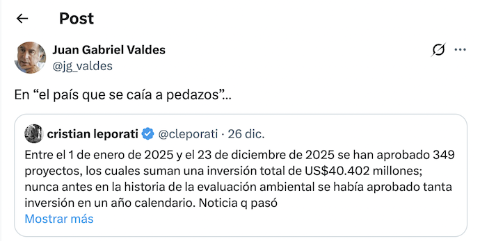 El posteo es del embajador de Chile en Estados Unidos @jg_valdes y simplemente apunta a un dato más que muestra que, a pesar de los muchos problemas, “Chile no se cae a pedazos”.