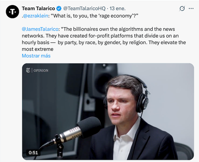 - @JamesTalarico: “Los multimillonarios son dueños de los algoritmos y las cadenas de noticias. Han creado plataformas con fines de lucro que nos dividen a cada hora: por partido, por raza, por género, por religión. Elevan las voces más extremistas de forma muy estratégica para provocar nuestra indignación, porque eso genera más clics, lo que a su vez les genera más dinero. Nos están vendiendo el conflicto directamente al torrente sanguíneo y lo llaman conexión”.