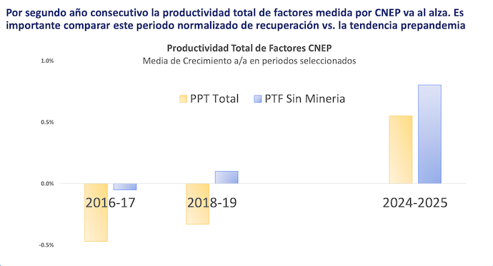 - El Informe Anual de Productividad 2025 da cuenta de que en 2024 y 2025 la productividad aumentó entre 0,5% y 0,6% y la no minera más de 1%.