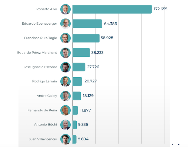 - Los CEO con más presencia: Roberto Alvo de Latam; Eduardo Ebensperger, CEO Banco Chile; y dos del Grupo Matte: Francisco Ruiz-Tagle, CEO de CMPC, y Juan Ignacio Escobar, de Colbún. Entremedio se mete Eduardo Pérez Marchant, gerente general de Parque Arauco.