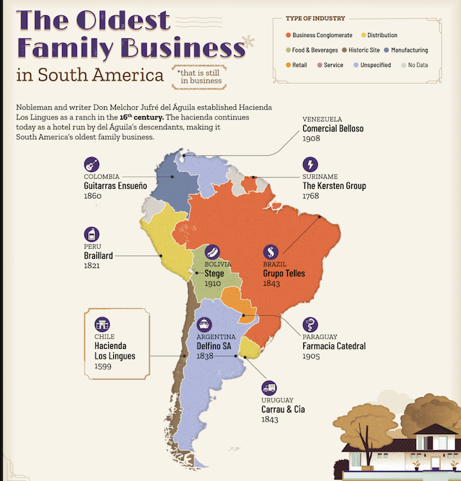 El negocio familiar más antiguo de Sudamérica es chileno. Se trata de Hacienda Los Lingues. Sus operaciones se remontan a una merced de tierras otorgada en 1599 por la Corona Española y actualmente la administra la familia Angulo y se dedica al sector de hotelería boutique, turismo de estancia y crianza de caballos de pura raza chilena.