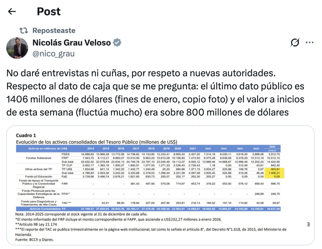 - La réplica de Grau vino por X y con guante puesto: el exministro Nicolás Grau sostuvo que el “último dato público” (fin de enero) muestra US$ 1.406 millones y que, a inicios de esa semana, el saldo “fluctuante” estaba sobre US$ 800 millones. Traducción: para Grau, el titular “no cuadra” y el debate se está armando con fotos distintas del mismo mesón.
