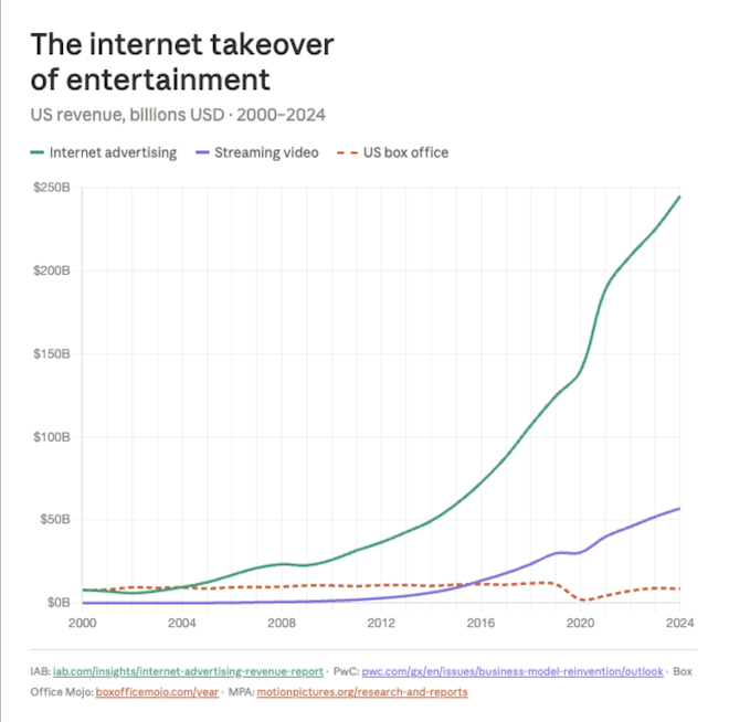 Cortito: este gráfico muestra cómo internet pasó a dominar el negocio de la entretención. Las últimas cifras muestran que los ingresos de las salas de cine y teatro están estancados y que nunca se recuperaron de la pandemia.