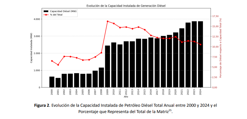 La investigación, titulada “Evaluación de la Capacidad de Generación Térmica de Respaldo Diésel Conectada a Nivel de Transmisión”, fue desarrollada por el Instituto de Sistemas Complejos de Ingeniería (ISCI) de la Universidad de Chile para la Fundación Chile Sustentable. El documento advierte que actualmente el país posee 3.862 megavatios (MW) de capacidad instalada diésel, pero que en condiciones normales apenas se utiliza un 10% de esta. Incluso en eventos extremos, como el apagón nacional del 25 de febrero de 2025, el uso no superó el 24%.