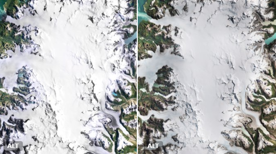 - La imagen más antigua, capturada por el satélite Landsat-5 en febrero de 1987, muestra una extensión de hielo robusta y poderosa que descendía con fuerza hacia el océano Pacífico. En contraste, la captura más reciente, tomada casi en la misma fecha de 2024 por el satélite Sentinel-2 del programa Copernicus, revela una escena inquietante: el hielo ha retrocedido tantos kilómetros que, donde antes había glaciares, ahora hay lagunas y sedimentos.