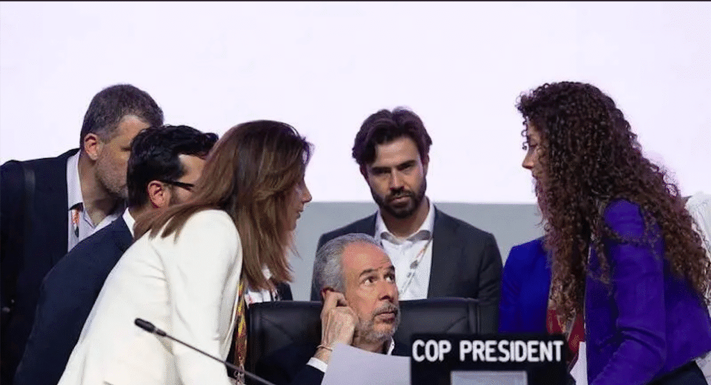 La discusión final del mutirão se tornó áspera, con países reclamando la ausencia de un espacio específico para debatir sobre el sector energético. Arabia Saudita rechazó de plano cualquier referencia a la transición, mientras negociadores de distintos bloques se reunían directamente entre sí, sin mediación de la presidencia. Durante la noche, delegaciones describieron una sesión “difícil e intensa”, en la que se abrieron cuatro grupos de negociación, uno dedicado exclusivamente a combustibles fósiles, aunque sin avances sustantivos.