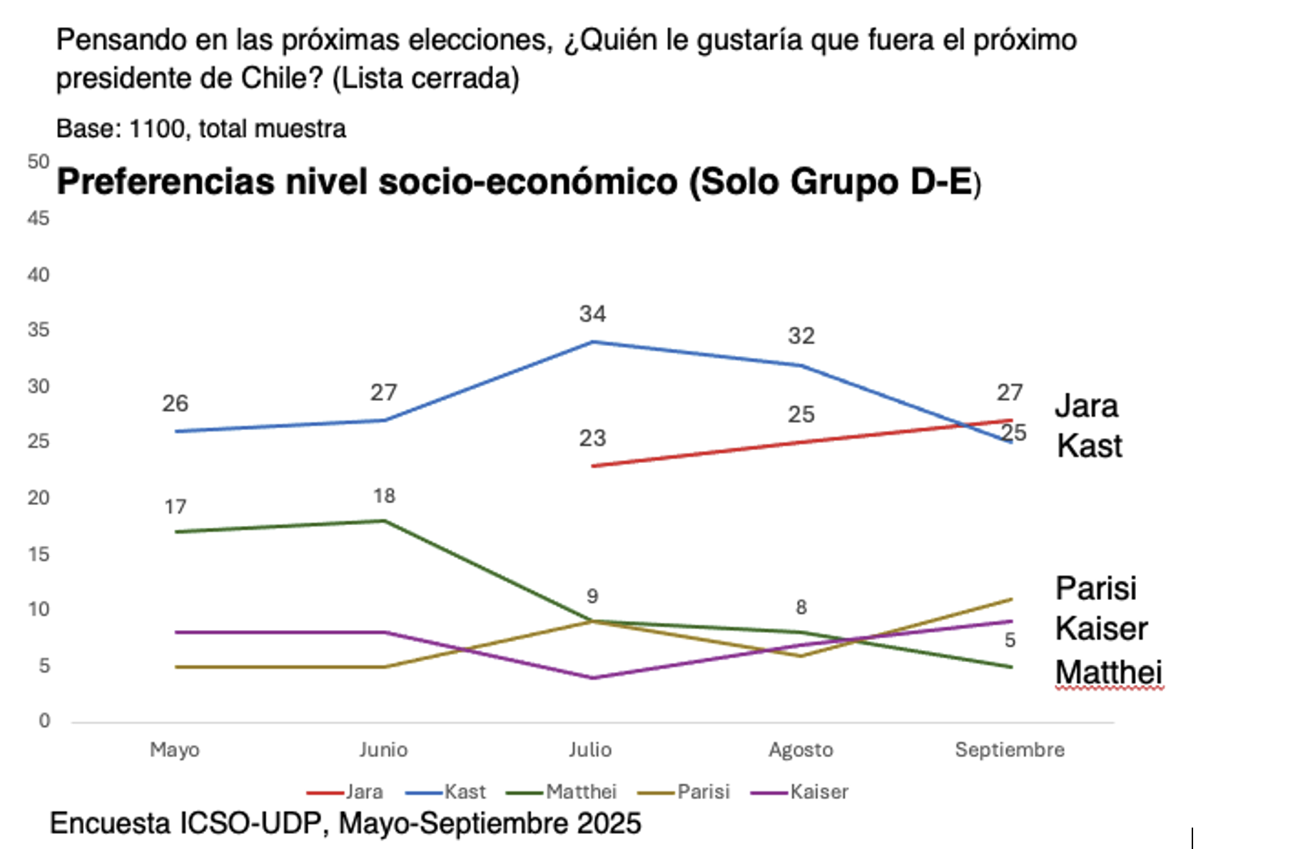 En otros términos, la caída en los sectores populares de Kast no está beneficiando a Matthei, sino que se está yendo para otras candidaturas. En nuestra encuesta, quienes se benefician con esa disminución han sido Kaiser y Parisi en primer lugar, y luego Mayne-Nicholls y Jara. En la siguiente gráfica se observan las preferencias presidenciales en el grupo D-E, que muestra de modo claro un cambio en los apoyos por grupo socioeconómico. Muy probablemente, el debate de los dos últimos meses sobre el “Chao préstamo” y la reducción del gasto fiscal en “US$ 6.000 millones” está perjudicando a Kast.