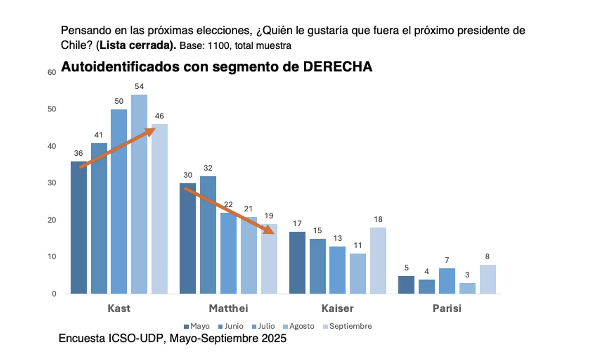 Una de las características de esta contienda electoral es la disputa por el votante que se autodefine como de derecha, que en nuestra encuesta representa un 32%. Observamos que Kast estaba capturando muy significativamente dicho votante hasta que en el mes de septiembre cayó significativamente. Esta caída –de nuevo– no está beneficiando a Matthei sino que más bien a Kaiser y a Parisi, quienes crecen en el mes de septiembre de modo considerable, como se observa en la siguiente gráfica. Así, los errores de Kast en su campaña no están hasta el momento tributando en beneficio de Matthei sino que a otras candidaturas del espectro de la derecha.