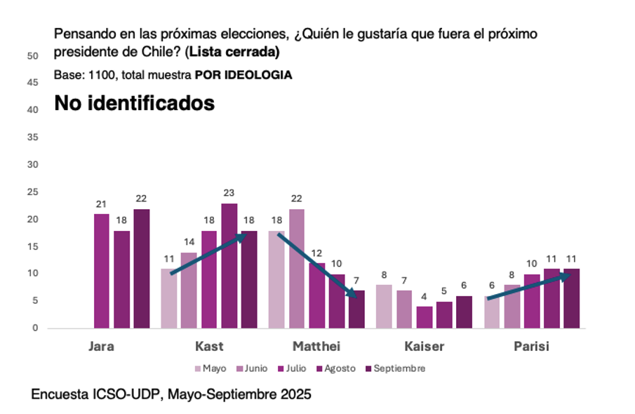 Aquellos que al momento de contestar la encuesta no se identifican en el eje izquierda-derecha se habían identificado con Matthei hasta junio, pero luego comenzaron a migrar hacia Kast hasta el mes de agosto. Muy probablemente el debate sobre el “Chao préstamo” y los riesgos del recorte de los “US$ 6.000 millones” hicieron que comenzaran a distanciarse de su candidatura, pero el gran beneficiado con ello ha sido Parisi, en primer lugar, y en segundo lugar, Jara. Al parecer, cuando el debate se ha centrado en la cuestión de la pérdida de beneficios sociales (pensiones, salud, educación, subsidios), aquello genera movimientos de apoyo que son relevantes de ser observados.