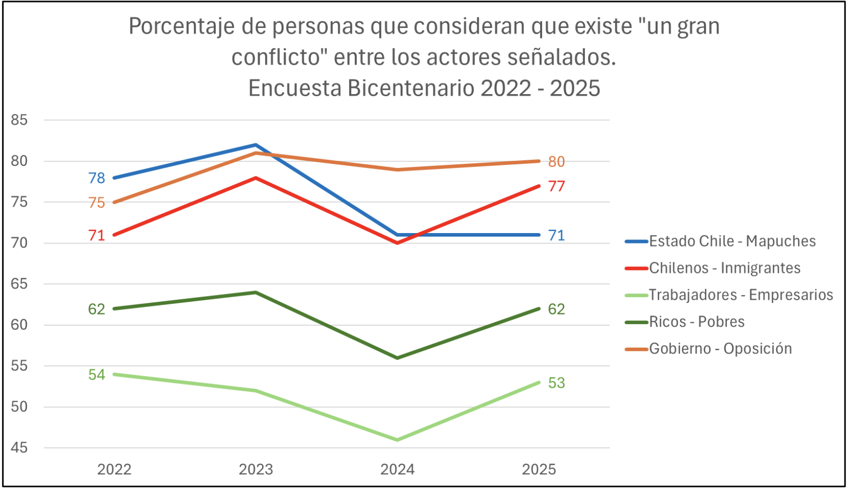 En este contexto, resulta particularmente interesante que durante el período analizado no se observe ningún aumento ni disminución sustantiva de la conflictividad social clásica —esto es, aquella asociada a la relación entre ricos y pobres o entre trabajadores y empresarios—, y solo se registre una disminución en la percepción de conflicto entre el Estado de Chile y el pueblo mapuche. Además, dos tipos de conflicto parecen intensificarse en la representación ciudadana: el que enfrenta a chilenos e inmigrantes, y el conflicto político entre el gobierno y la oposición.