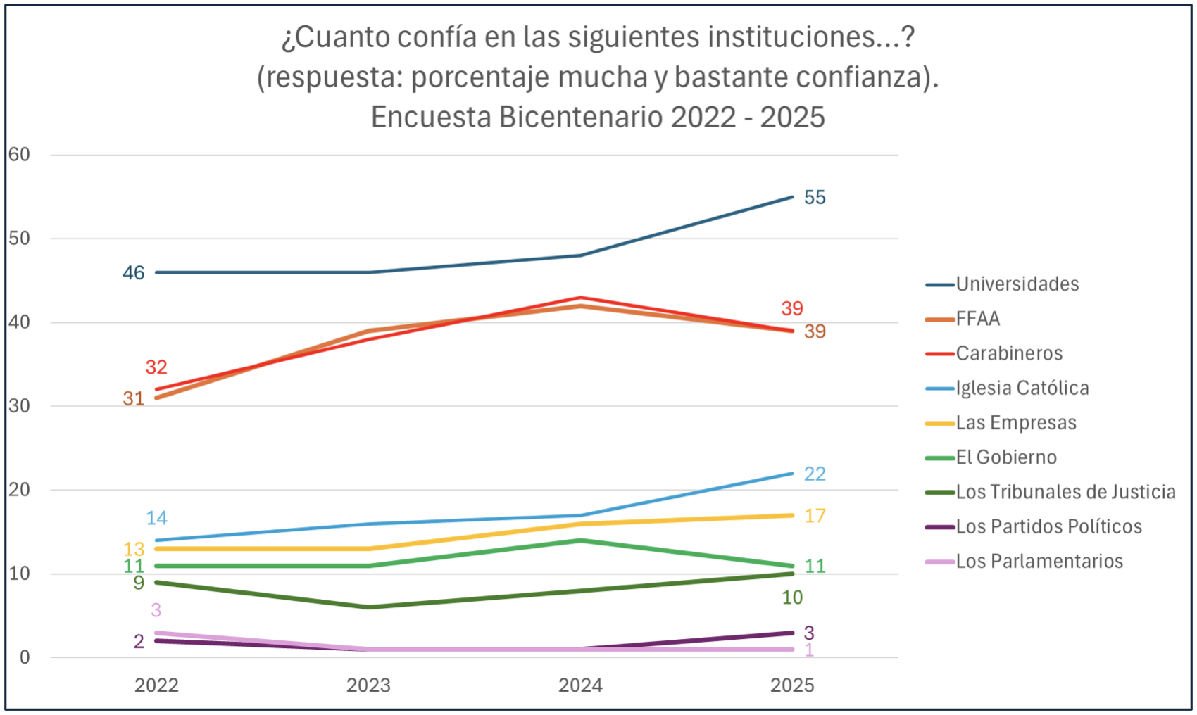 Este patrón contrasta de manera nítida con el estancamiento —en niveles muy bajos o casi nulos— de la confianza en el gobierno, los tribunales de justicia, los partidos políticos y el Parlamento.