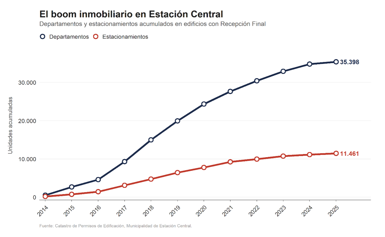 Uno de esos efectos es especialmente claro. Entre 2012 y 2021 se aprobaron en Estación Central más de 35 mil viviendas con recepción final, mientras que la cantidad de estacionamientos construidos fue inferior a un tercio del total. El resultado ha sido una presión creciente sobre el espacio público: más estacionamiento irregular sobre veredas y calzadas, deterioro del entorno peatonal, mayor congestión barrial y una sobrecarga adicional sobre el transporte público.