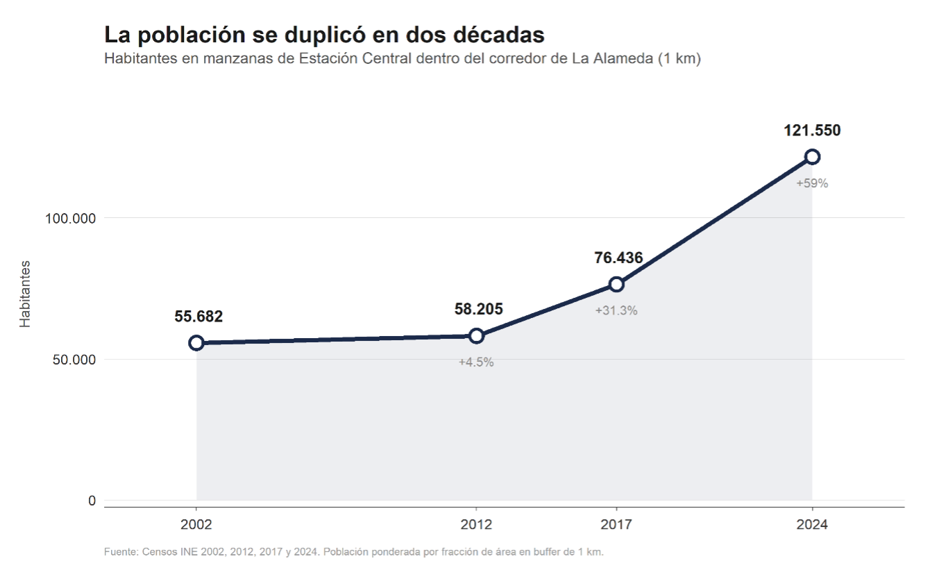 La magnitud del problema se vuelve aún más evidente cerca de la Alameda. De acuerdo con los datos del último censo, la población residente en un radio de un kilómetro en torno al proyecto pasó de poco más de 300 mil personas en 2012 a cerca de 450 mil en 2024. En Estación Central, el área contigua al proyecto duplicó su población, pasando de alrededor de 58 mil habitantes a más de 120 mil. Esta concentración no fue acompañada por una expansión equivalente de la infraestructura urbana, ni por una diversificación suficiente de las alternativas de viaje.