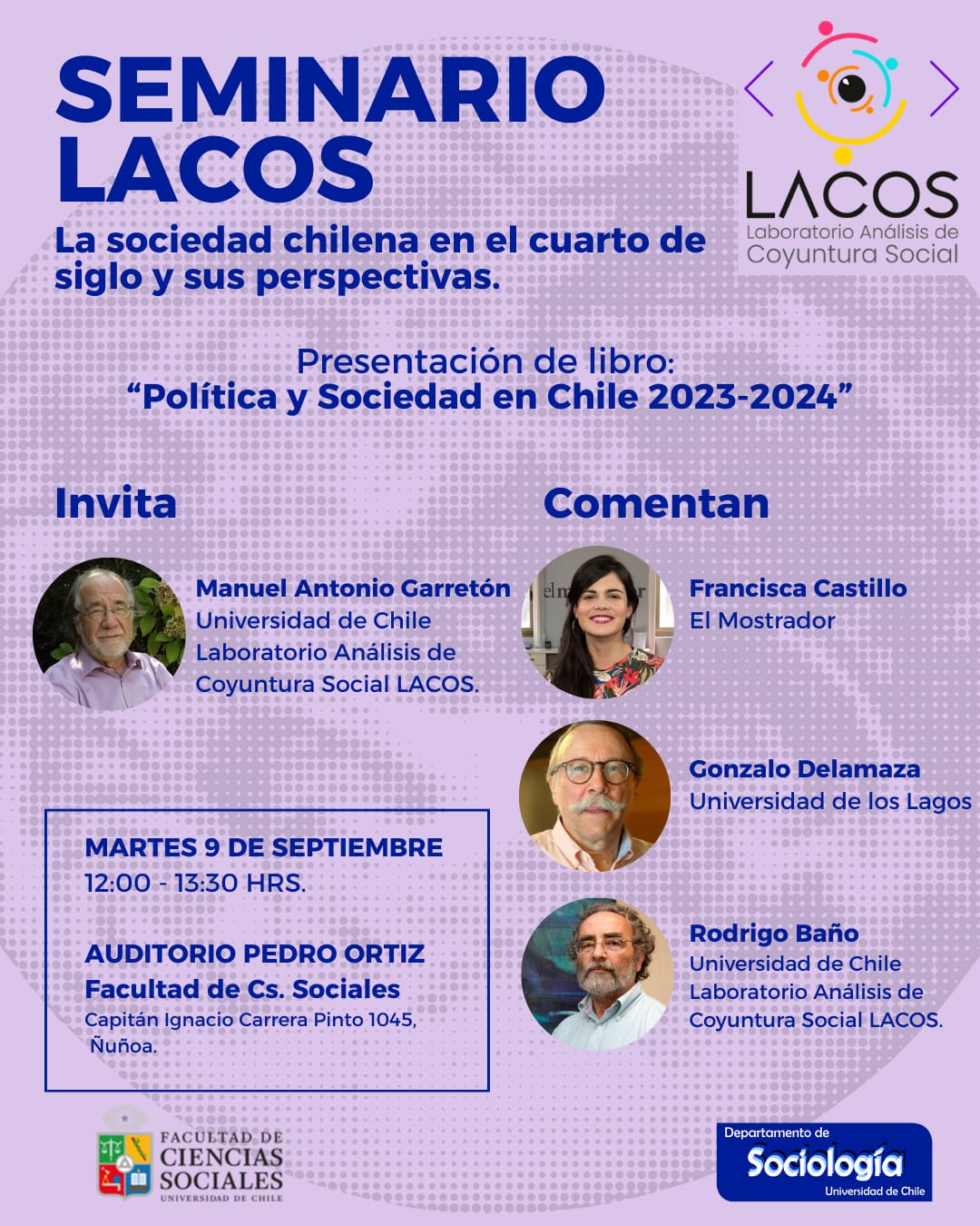 El próximo martes 9 de septiembre, el Laboratorio de Análisis de Coyuntura Social (LACOS) del Departamento de Sociología de la Universidad de Chile realizará el seminario “La sociedad chilena en el cuarto de siglo y sus perspectivas”, instancia en la que se presentará el libro “Política y Sociedad en Chile 2023-2024”.