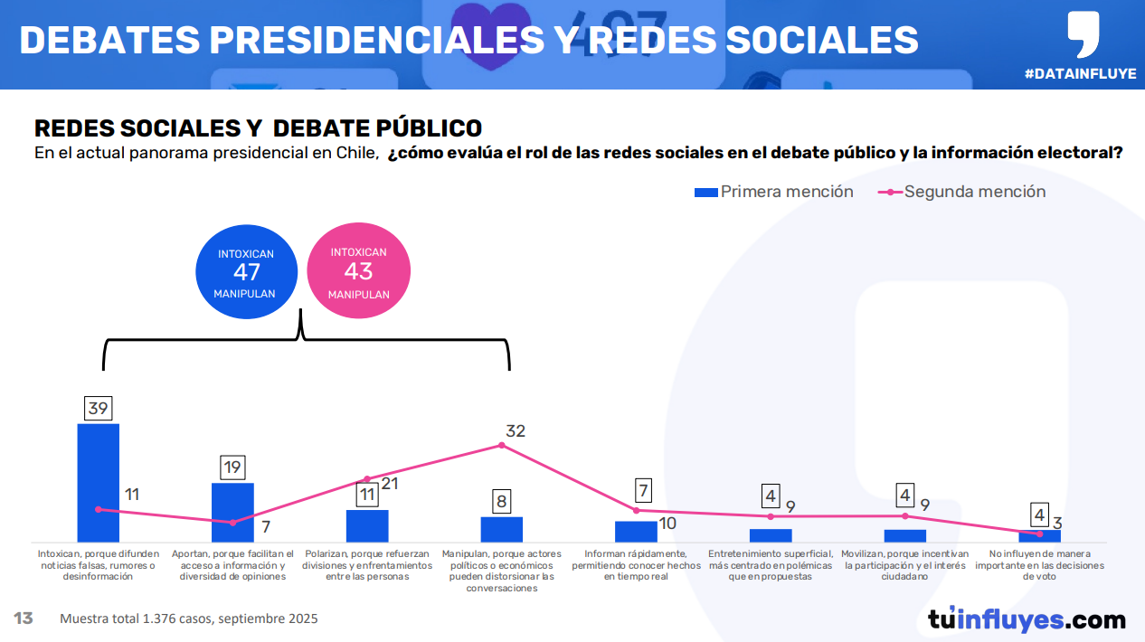 Un estudio de Data Influye reveló que un 39% percibe que las redes sociales intoxican el debate político por difundir noticias falsas, mientras que un 8% las ve como espacios de manipulación. Jeannette Jara lidera la intención de voto con 27%, seguida de Kast (26%) y Matthei (15%).