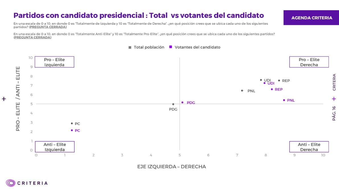 La encuesta también muestra una segmentación del espectro político chileno en torno a los ejes izquierda-derecha y anti-élite-pro-élite. En el cuadrante de derecha pro-élite se ubican la UDI y el Partido Republicano, percibidos tanto por la población como por sus propios votantes en posiciones similares de defensa del orden y cercanía con los sectores de poder.
