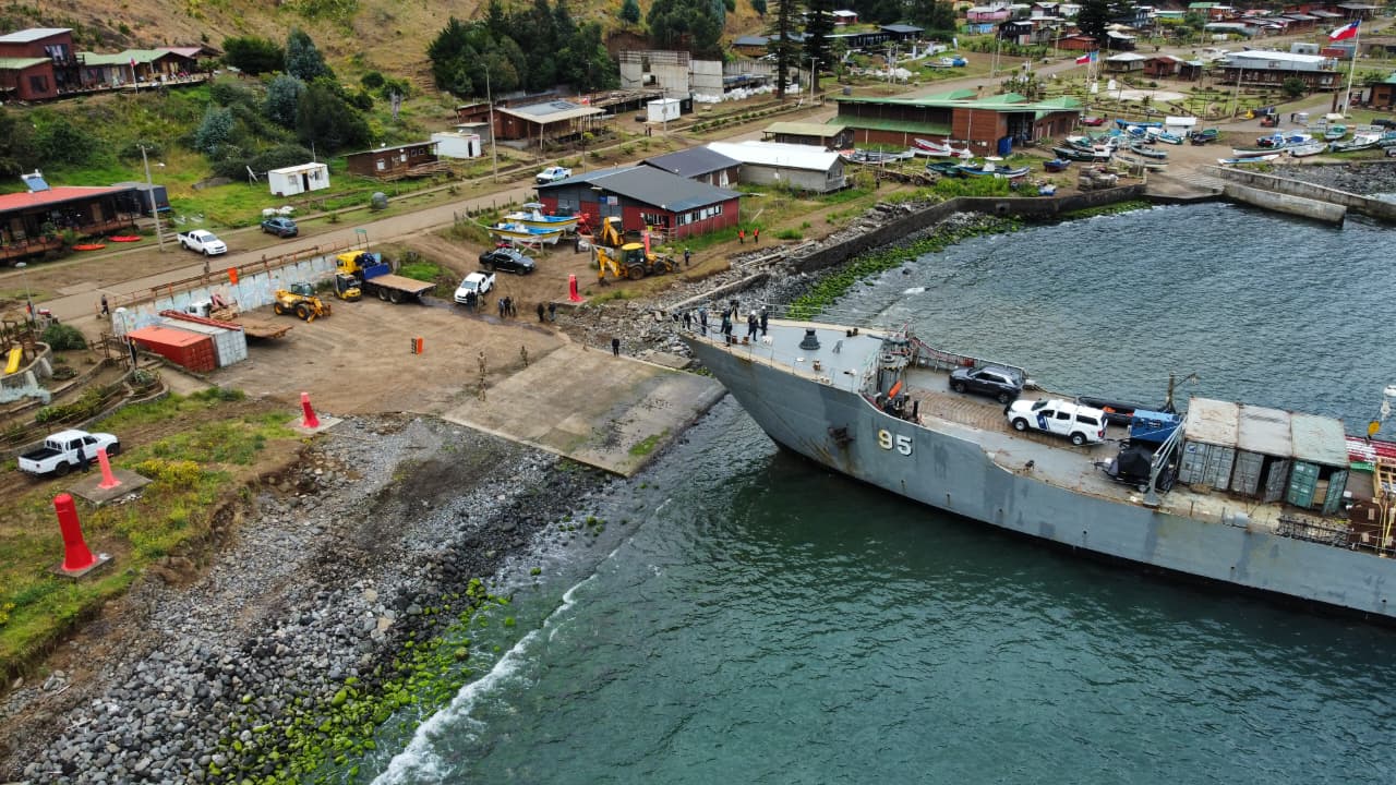 La barcaza Chacabuco arribó a la rampa fiscal con el vehículo, en una operación realizada sin contratiempos gracias al trabajo coordinado entre la Armada y el municipio.