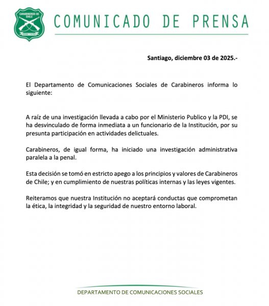 Carabineros informó que el funcionario fue desvinculado de manera inmediata. En un comunicado, la institución señaló que la medida se adoptó a raíz de la investigación llevada a cabo por el Ministerio Público y la PDI y que se inició una investigación administrativa paralela. La institución reafirmó que no tolerará conductas que vulneren sus principios, normas internas y la legislación vigente.