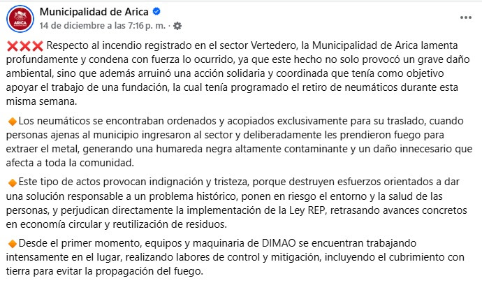 Presionada por los intensos reclamos sobre la toxicidad del incendio del 14 de diciembre, la Municipalidad de Arica emitió ese mismo día en sus redes sociales un confuso comunicado donde acusaba a terceros de haber iniciado el incendio de una «gran barricada de neumáticos» de desecho que había armado la Dimao, para donarlos a una institución cuyo nombre no revelaron.