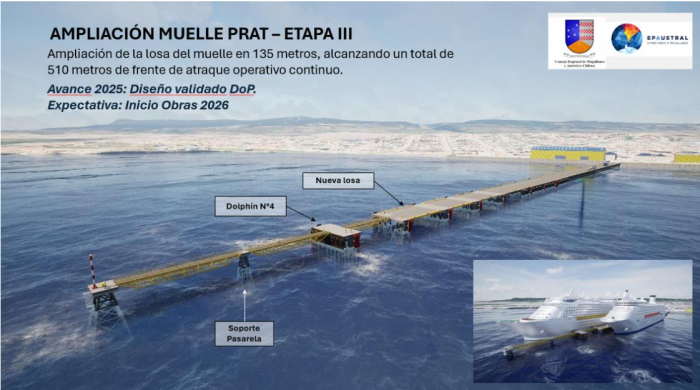 El próximo paso es la Etapa III del proyecto, cuya licitación está prevista para el segundo semestre de 2026. Esta fase contempla la continuidad de la losa y la construcción de un nuevo Dolphin, lo que permitirá un frente de atraque continuo de 510 metros y aumentará la capacidad tanto del sitio norte como sur del puerto.